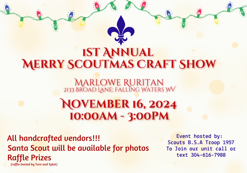 Scouts B.S.A. Troop 1957 of Marlowe West Virgina is hosting a craft fair this fall. The proceedes from this event go directly to Troop 1957. The funds will be used to purchase camping equipment. Help pay for dues, field trips, and summer camp.